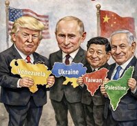 5 janvier, par JLGDes hommes sans scrupules, ivres de pouvoir, brandissent chacun un territoire conquis ou convoité comme un trophée, un fragment de carte arraché à un peuple bien réel.